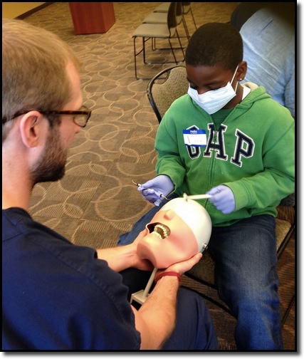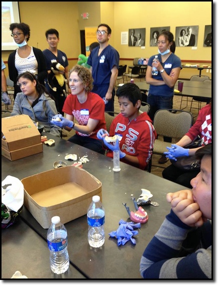 Our young medical scholars had the opportunity not only to learn about dentistry but also to have hands-on experience in aspects of dental practice. Above, scholars learn how to make dental impressions; below, one of our scholars gets a feel for using a dental scaler on patient model.